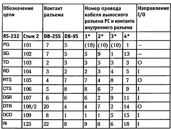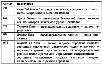 В табл. 2.1 приведено назначение контактов разъемов СОМ-портов (и любой другой аппаратуры АПД). Контакты разъема DB-25S определены стандартом EIA/TIA-232-E, разъем DB-9S описан стандартом EIA/ TIA-574. У модемов название цепей и контактов такое же, но роли сигналов (вход-выход) меняются на противоположные.