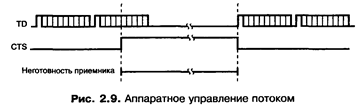 Аппаратный протокол управления потоком RTS/CTS (Hardware Flow Control) использует сигнал CTS, который позволяет остановить передачу данных, если приемник не готов к их приему (рис. 2.9). Передатчик «выпускает» очередной байт только при включенной линии CTS. Байт, который уже начал передаваться, задержать сигналом CTS невозможно (это гарантирует целостность посылки). Аппаратный протокол обеспечивает самую быструю реакцию передатчика на состояние приемника. Микросхемы асинхронных приемопередатчиков имеют не менее двух регистров в приемной части —