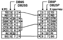 Кроме этих двух распространенных стандартных протоколов, поддерживаемых и ПУ, и ОС, существуют и другие. Некоторые плоттеры с последовательным интерфейсом используют программное управление, но посылают не стандартные символы XON/XOFF, а слова (ASCII-строки). Такой обмен на уровне системной поддержки протокола практически не поддерживается (эти плоттеры непосредственно«разговаривают» с прикладной программой). Конечно, можно написать драйвер СОМ-порта (перехватчик INT 14h), но необходимость обработки в нем текстовых сообщений от устройства вывода обычно не вызывает восторга у системного программиста. Кабель для подключения совпадает с приведенным на рис. 2.12.