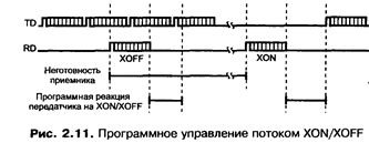 XON (llh), приняв который противоположное устройство возобновляет передачу. Время реакции передатчика на изменение состояния приемника по сравнению с аппаратным протоколом увеличивается по крайней мере на время передачи символа (XON или XOFF) плюс время реакции программы передатчика на прием символа (рис. 2.11). Из этого следует, что данные без потерь могут приниматься только приемником, имеющим дополнительный буфер принимаемых данных и сигнализирующим о неготовности заблаговременно (имея в буфере свободное место).