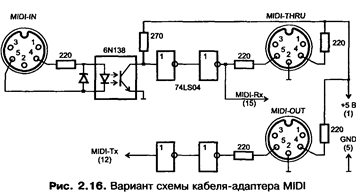 В PC MIDI-порт имеется на большинстве звуковых адаптеров, его сигналы выведены на неиспользуемые контакты (12 и 15) разъема игрового адаптера. Для подключения устройств MIDI требуется переходной адаптер, реализующий интерфейс «токовая петля». Переходной адаптер обычно встраивается в специальный кабель, схема которого приведена на рис. 2.16. Некоторые модели PC имеют встроенные адаптеры и стандартные 5-штырьковые разъемы MIDI.