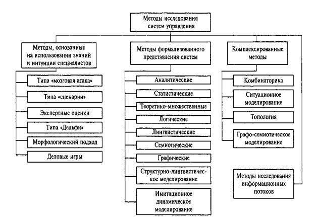 Всю совокупность методов исследования можно разбить на три большие группы: методы, основанные на использовании знаний и интуиции специалистов; методы формализованного представления систем управления (методы формального моделирования исследуемых процессов) и комплексированные методы.