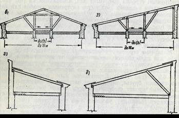 - односкатная крыша (рис. 1, а) устраивается над зданиями небольшой ширины. Отвод воды организован только к одной из продольных стен;