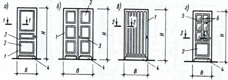 Рис.3. Полотна деревянных дверей: а — щитовое глухое; б — остекленное; в — филенчатое;