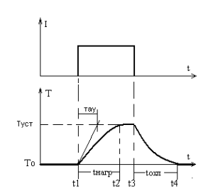 После включения тока температура повышается, в момент t2 она стабилизируется, в момент t3 ток отключается и температура начинает спадать, а в момент t4 вновь достигает уровня То.