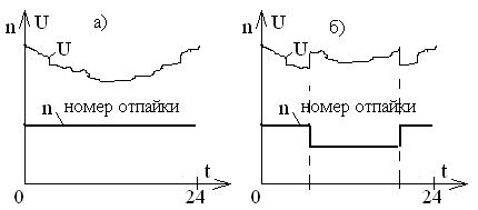 1) По времени суток. Используется, если параметры суточного графика остаются стабильными изо дня в день. На рисунке 4.12.а) приведен пример графика напряжения на шинах ЦП при отсутствии регулирования напряжения. При этом отмечается значительное снижение напряжения в дневное время.