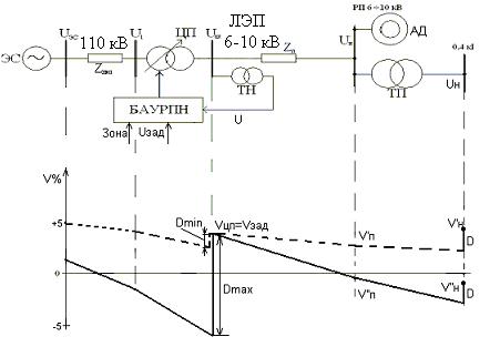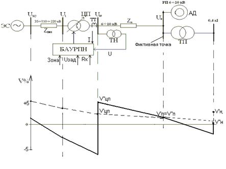 При этом автоматический регулятор обеспечивает с определенной степенью точности уровень напряжения на шинах ЦП, равный сумме напряжения уставки Uзад и потери напряжения от ЦП до фиктивной точки ΔU: