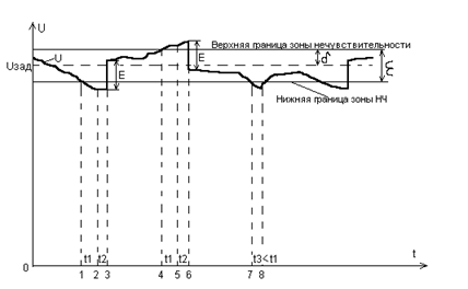 В начальный момент времени 0 регулируемое напряжение находилось внутри зоны нечувствительности регулятора (ε). Далее в момент времени 1,понижающееся напряжение вызвало срабатывание чувствительного органа регулятора и начался отсчёт времени. По истечении выдержки времени t1 в момент 2 подаётся команда на переключение отпайки и через время t2 (время работы переключающего механизма) напряжение скачком возрастает на величину, определяемую ступенью регулирования (E) и вновь оказывается внутри зоны ε. В промежуток времени 4,5,6 происходит аналогичный процесс переключения с той лишь разницей, что переключатель возвращается в прежнее положение. В промежуток времени 7,8 произошло кратковременное понижение напряжения, на которое регулятор не среагировал, т.к. его выдержка времени t1 оказалась больше, чем длительность этого понижения напряжения t3.