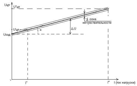 При таком законе регулирования автоматический регулятор обеспечивает с определенной степенью точности поддержание напряжения на шинах 6-10 кВ ЦП на уровне, определяемом напряжением уставки Uзад (задающим напряжением).