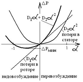 Практически это означает, что если мы хотим иметь минимум активных потерь внутри СД, то должны работать в режиме недовозбуждения (т.е. в режиме потребления РМ из сети при