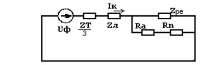 Расчетная схема однофазного замыкания на землю (на корпус) (рис.6.3) включает в себя сопротивления трансформатора Zт, фазного провода Zл, защитного зануляющего провода Zpe, повторного заземления Ra и заземления нейтрали Rn. Учитывая, что Ra+Rn >>Zpe, можно записать выражение для тока к.з.: