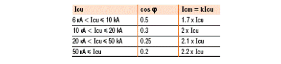 Icm – величина максимального мгновенного значения тока (ударного тока), который данный автоматический выключатель может включить при номинальном напряжении в оговоренных условиях эксплуатации. В системах переменного тока эта мгновенное пиковое значение связано с Icu (т.е. с номинальным предельным током отключения) ударным коэффициентом k, зависящим от коэффициента мощности (cosφ) контура короткого замыкания (табл.2).