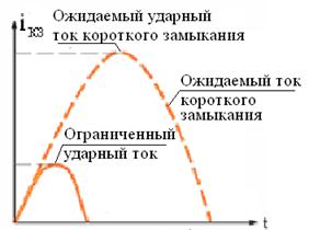 Способность токограничивающего выключателя ограничивать ток короткого замыкания заключается в том, что он может предотвращать протекание максимального ожидаемого тока короткого замыкания и допускать лишь ограниченный ток (рис.6). Ожидаемый ток КЗ - это ток, который протекал бы в цепи при отсутствии токоограничения.
