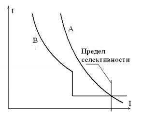 Предельный ток селективности в данном случае равен уставке мгновенной токовой отсечки ImA вылючателя А: полная селективность будет обеспечена, если ток КЗ в цепи В IcsB будет меньше тока ImA.