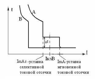 Согласование время-токовых характеристик (селективность срабатывания) автоматических выключателей A и B (рис.7.9.а) является полным (полная селективность), если максимальная величина тока короткого замыкания в цепи B (IкзB) не превышает уставку отсечки автоматического выключателя A (ImA). При этом условии только выключатель B будет отключать ток IкзB (рис.7.10).