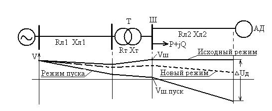 В исходном режиме АД отключен, отклонение напряжения на двигателе равно отклонению на шинах Vш. В течение пуска и разгона большой пусковой ток, вызывает потери напряжения в элементах сети, напряжение на двигателе снижается на величину ΔUд. После окончания разгона ток АД уменьшается, наступает новый установившийся режим, в котором напряжение немного ниже, чем в исходном.