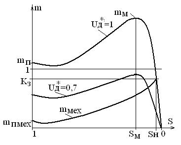 При неподвижном роторе скольжение S равно 1, развиваемый двигателем момент называется пусковым m П. При увеличении скорости скольжение уменьшается, вращающий момент возрастает до максимального (критического) m М. При номинальном напряжении на двигателе рабочий режим определяется пересечением характеристики двигателя U*Д=1 с характеристикой приводимого механизма m МЕХ. Коэффициент загрузки двигателя при этом Кз = Ммех / Мн, где Ммех – тормозной момент, Мн –номинальный вращающий момент АД (рис.8.2).