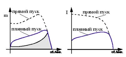 Система плавного пуска имеет характеристики, отличающиеся от остальных методов пуска. Принцип ее действия основан на регулировании действующего значения напряжения на двигателе с помощью встречно-параллельных тиристоров с управляемым углом открытия (рис.5). На первом этапе запуска напряжение, подаваемое на мотор настолько мало, что позволяет только выбрать зазоры в редукторах или натянуть приводные ремни или цепи, что позволяет избежать нежелательных рывков при пуске. Постепенно напряжение и крутящий момент возрастают и механизм разгоняется.