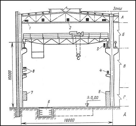 На рис 1, представляющем собой поперечный разрез пролёта производственного помещения цеха, показаны открытые шинные магистрали 1, расположенные в верхней зоне (А) цеха. Там же установлен осветительный шинопровод 2. На капители колонны в зоне (Б) расположен троллейный шинопровод 3 для питания мостового крана, по конструкциям вдоль стены цеха в зоне (В) размещены распределительный 4 и магистральные 8 шинопроводы. В цехе в зоне (Д) имеется кабельный канал 6 для прокладки внутрицеховых кабелей, распределительный шкаф (РШ) 5 для питания силовых ЭП и осветительный щиток 7 зона (Г). (Шинопроводом называется жесткий токопровод заводского изготовления напряжением до 1 кВ, поставляемый комплектными секциями.)