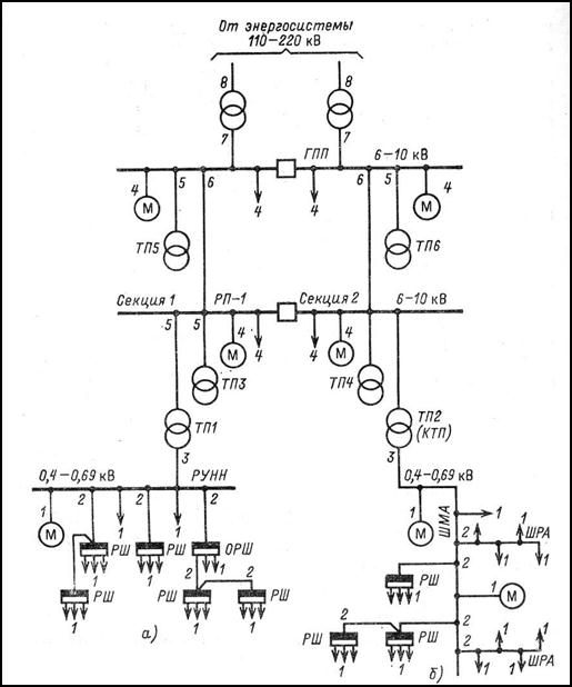 Пример радиальной схемы приведен на рис.9.2 а. Здесь от секции 1 распределительного пункта РП-1 напряжением 6-10 кВ радиальной линией питается трансформатор ТП1. От распределительного устройства низкого напряжения (РУНН) отдельными линиями питаются крупные ЭП (например М) и РШ, к которым подключены более мелкие ЭП.