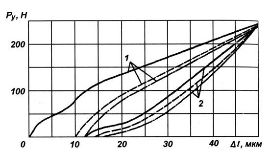 При этом ветви нагружения 1 и разгружения 2 не совпадают. Это объясняется наличием зазоров в стыках узлов, потерей энергии на преодоление сил трения в сопряжениях и на контактные деформации. При повторных нагружениях (штриховые линии) и разгружениях (штрихпунктирные линии) петля гистерезиса уменьшается. Кроме статистического метода, применяют динамический метод определения жесткости элементов в процессе резания.