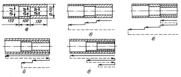 Рассмотрим черновую обработку одного конца ступенчатого вала из проката диаметром 100 мм (рис. 4, а). Возможные варианты обработки ступеней этого вала показаны на рис. 4, б-д.