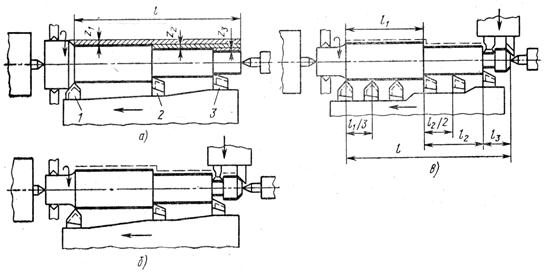 Многорезцовая обработка обеспечивает сокращение основного времени за счет уменьшения длины резания. Ее применение наиболее целесообразно при обработке заготовок ступенчатых валов, когда ступени располагаются по возрастающей степени. Обработку можно выполнять по двум схемам (рис. 5). Чтобы полностью использовать преимущества многорезцовой обработки, необходимо обеспечить одновременную работу всех суппортов. При использовании в качестве заготовки проката обработку ведут по методу деления припуска Z1, Z2, Z3 (рис. 5, а), так как на участках с меньшими диаметрами припуск получается большим. При изготовлении валов из ступенчатых заготовок ход продольного суппорта определяется длиной l1 наибольшей ступени (рис. 5, б) или l3 наименьшей ступени (рис. 5, в). В последнем случае для обработки остальных ступеней устанавливают по несколько резцов. Число резцов в наладке лимитируется жесткостью обрабатываемых деталей, мощностью станка и сложностью конструкций резцедержателей.
