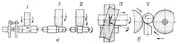 Рис. 7. Схемы обработки заготовок валов на круглошлифовальных станках (а) и бесцентровошлифовальных (б):