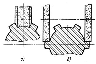 Шлицы закаливаемых валов шлифуют на шлицешлифовальных полуавтоматах. Схемы шлифования зависят от способа центрирования. Так, при центровании по внутреннему диаметру шлифование может производиться профильным кругом с одновременным шлифованием боковых поверхностей (рис. 8, а). При центровании по наружному диаметру боковые поверхности шлифуются двумя кругами (рис. 8, б). Шлифование наружной поверхности выполняется на обычных круглошлифовальных станках.