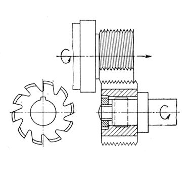 Фрезерование резьбы выполняют на резьбофрезерных станках дисковыми (при фрезеровании длинных резьб) и гребенчатыми (при фрезеровании коротких резьб) фрезами. Валы сельскохозяйственных машин имеют обычно короткие резьбы, и поэтому наибольшее применение получило фрезерование гребенчатыми фрезами, обеспечивающее высокую производительность и точность обработки резьб (рис. 10).