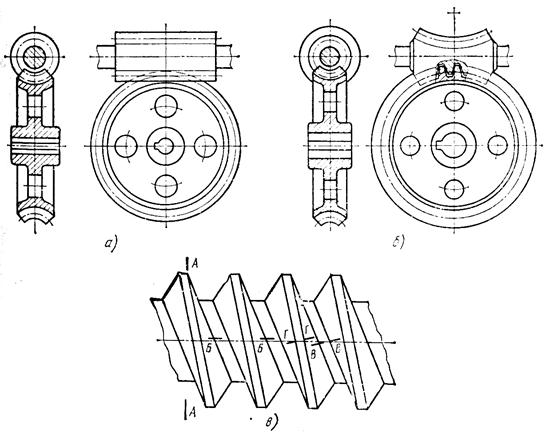 а – цилиндрическая; б – глобоидная; в – сечения цилиндрических червяков:
