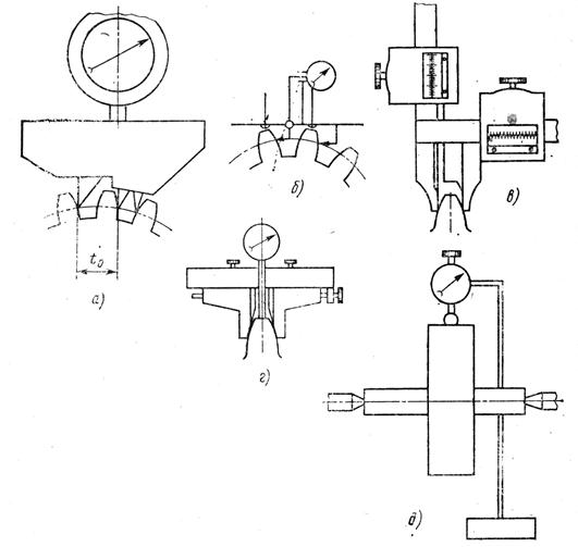 2) отклонение основного шага – шагомером по разности действительного и заданного расстояния между параллельными касательными к двум соседним одноименным профилям зубьев (рис. 3, а);