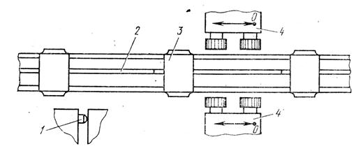 Рассмотрим пример. Двухшпиндельные фрезерные головки 4 (рис. 3) перемещаются влево до упора 1, осуществляя последовательно черновую и чистовую обработку заготовки 3, которая зафиксирована в рабочей позиции. Конвейер 2 подает следующую заготовку, при этом головки перемещаются в исходное положение. Затем цикл обработки повторяется. Фрезерованием в два перехода (черновой и чистовой) достигают точности 10-го квалитета, шероховатости Rа = 3,2…1,6 мкм. В серийном производстве обработку ведут с использованием всей рабочей поверхности стола, устанавливая несколько заготовок. Шлифование производят на плоскошлифовальных станках периферией круга, торцом чашечного круга, торцом сборного сегментного круга. Плоское силовое шлифование малочувствительно к литейным коркам и прерывистым поверхностям, поэтому заготовки можно шлифовать без предварительной обработки фрезерованием или строганием при сравнительно малых припусках (3-5 мм). В массовом производстве широко используют протягивание наружных поверхностей жестких деталей. Его применяют для черновой и чистовой обработки, а также для зачистки и калибрования. Протягивание высокопроизводительно. Его выполняют на специальных мощных, быстроходных протяжных станках протяжками из твердых сплавов со скоростью резания до 60 м/мин (чугун). Протяжные станки горизонтального и вертикального типов, однопозиционные и многопозиционные встраивают в автоматические линии. При высоких требованиях к точности и шероховатости поверхностей вводят отделочную операцию, тонкое шлифование или фрезерование. В мелкосерийном производстве базовые поверхности шабрят.