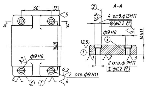 1) обработка установочной базовой плоскости и изготовление 2-х технологических отверстий по 7-му квалитету;