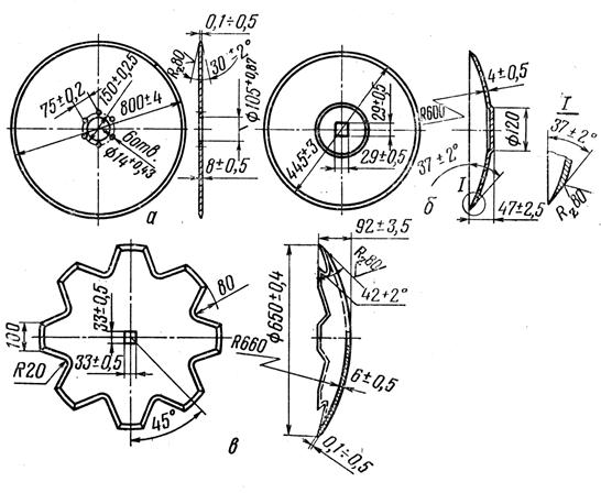 По конструкции можно выделить плоские, сферические и вырезные диски (рис. 2). Обычно они изготовляются из стали 65Г, в некоторых случаях из стали 70Г диаметром от 250 до 800 мм и толщиной 2,5…8 мм. Рабочая зона дисков подвергается термической обработке токами высокой частоты до твердости 35…45 НRС. Диски сеялок не закаливаются.
