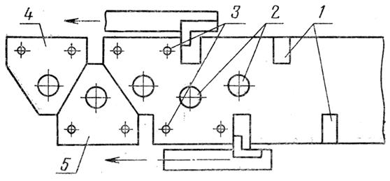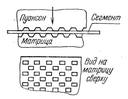 Листы разрезаются на полосы с помощью гильотинных ножниц. На штампе вырубаются сегменты и пробиваются отверстия. На рис. 9 показана схема разделения полосы на сегменты при их вырубке, обеспечивающая минимальные потери металла. За один рабочий ход пресса вырубаются два сегмента, снабженных отверстиями под заклепки и клеймом завода-изготовителя. На первой позиции вырубаются два паза 1, на второй - пробиваются два отверстия 3 и ставятся клейма 2 завода, на третьей – от полосы отсекаются два сегмента 4 и 5. Перемещение полосы в штампе и подача ее в штамп автоматизированы. После вырубки сегменты проходят правку в вафельных штампах (рис. 10). В таком штампе пуансон и матрица имеют правильно чередующиеся выступы и впадины (в шахматном порядке), причем выступы на пуансоне попадают во впадины матрицы. Заготовка на таком штампе как бы многократно перегибается, обеспечивая создание плоской поверхности.