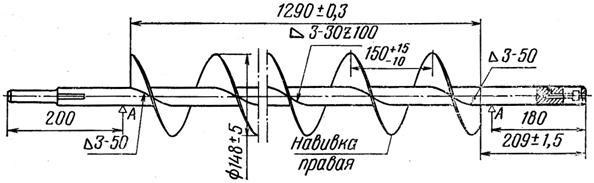 На рис. 17 изображен колосовой шнек самоходного комбайна. Вал шнека длиной 1717 мм имеет диаметр 28 мм. Спираль с наружным диаметром 148 мм имеет шаг 150 мм. Спираль к валу приваривается прерывистым швом. К готовому шнеку предъявляются следующие технические требования. Радиальное биение спирали по наружному диаметру не должно выходить за пределы допуска на диаметр 148 мм. Радиальное биения концов вала относительно опор А допускается не более 0,5 мм.