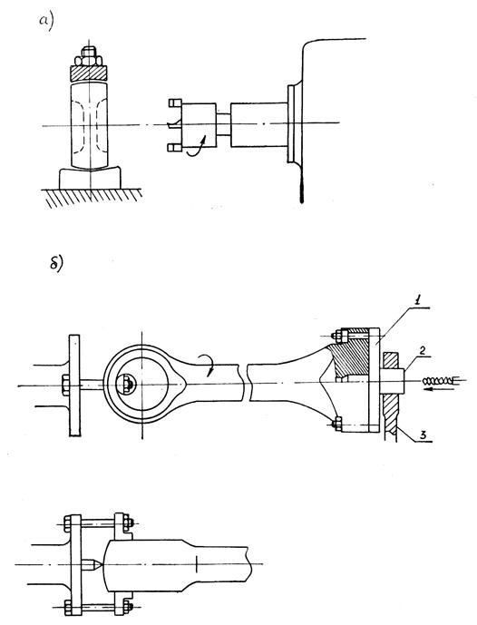 операция 40 - сверление центрального отверстия в стержне шатуна и подрезка плоскости разъема с крышкой на токарном станке. Для сверления отверстия вдоль шатуна его закрепляют верхней головкой непосредственно в патрон токарного станка или используют специальное приспособление (рис. 9, б), а под цилиндрическую поверхность нижней головки подводят люнет или используют кондуктор 1, шейка 2которого поддерживается люнетом 3. Отверстия сверлят сперва коротким, а потом удлиненным сверлом, закрепленным в суппорте. Через сверло подается от насоса жидкость для охлаждения и вымывания стружки. Отверстия диаметром свыше 40...50 мм сверлят перовым сверлом;