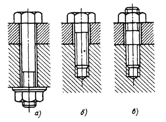 Резьбовые соединения в конструкциях машин составляют 15…25 % от общего числа соединений, поскольку они отличаются простотой, надежностью, а также возможностью разборки и повторной сборки без замены деталей. Трудоемкость сборки резьбовых соединений (болтовых, винтовых, шпилечных, рис. 8) составляет 25…35 % от общей трудоемкости сборочных работ. Процесс сборки резьбовых соединений состоит из следующих этапов: соединение (наживление) резьбовых деталей на 2…3 нитки; их свинчивание; затяжка и стопорение для предохранения от самоотвинчивания.