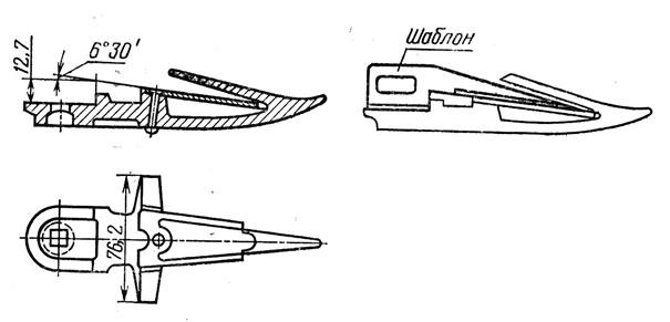 При сборке пальца с вкладышем базовой деталью является палец 1 (рис. 2). В него вставляется вкладыш 2 и приклепывается заклепкой с потайной головкой. Для нормальной работы режущего аппарата все вкладыши должны быть расположены на одном уровне и под одним углом. Для этого должны быть выдержаны размер 12,7 мм и угол 6°30¢ (рис. 3). Чтобы обеспечить эти требования, одновременно с приклепыванием вкладышей производится подгибка пальца (ковкий чугун или сталь) на эксцентриковом прессе с усилием 0,75-1 МН. Для контроля положения вкладыша служит шаблон, показанный на рис. 3.