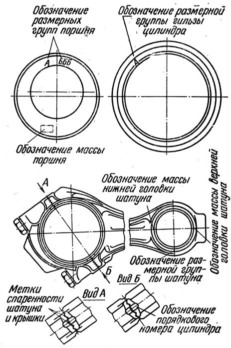 Сборка шатунно-поршневой группы. Сборка поршней с шатунами производится с учетом размерных и весовых групп шатуна, поршня, гильзы и поршневого пальца, которые указываются на обусловленных местах деталей (рис. 4).