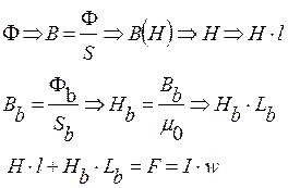 В случае задачи обратной по заданным значениям F = Iw, размерам магнитопровода lk, Sk и кривым намагничивания определяют магнитные потоки в магнитопроводах.