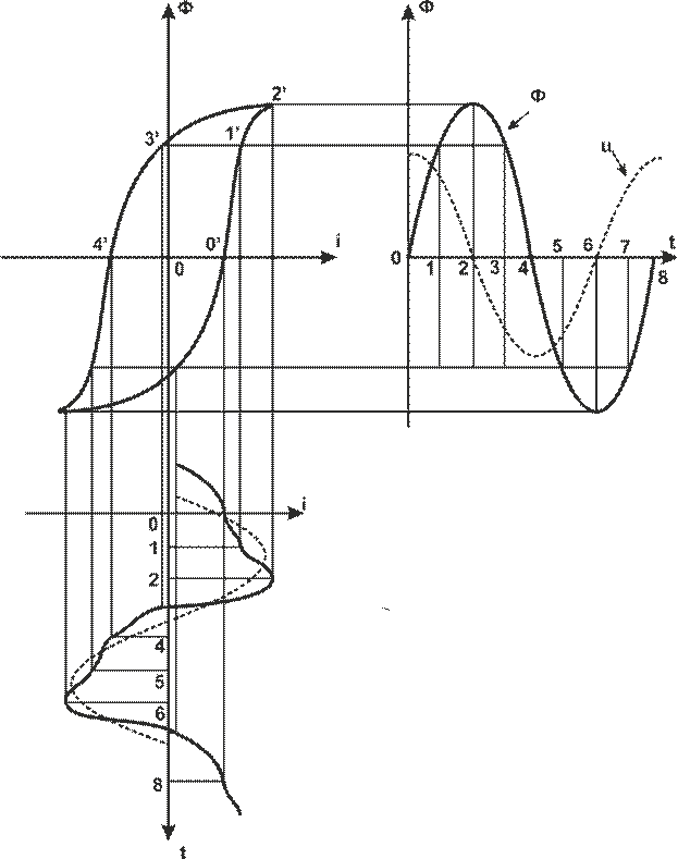 Кривая тока отлична от синусоиды. максимумы i(t) и Ф(t) по времени совпадают, но ток проходит через 0 раньше, чем магнитный поток, что обусловлено гистерезисом. Кривая тока содержит высшие гармоники преимущественно третью пятую и седьмую.