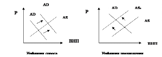 Различают инфляцию спроса и инфляцию предложения (издержки). Первая – есть результат избыточного совокупного спроса при полной занятости, вторая – следствие роста средних издержек на единицу и снижение совокупного предложения вследствие избыточного роста номинальной заработной платы по сравнению с производительностью труда, роста цен на сырье, увеличение налогов.