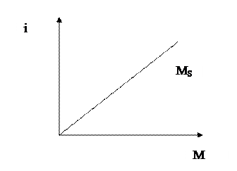 Состояние на денежном рынке, когда количество предлагаемых денег равно объему спроса населения на деньги, называется равновесием денежного рынка. Если денежная масса в обществе контролируется Центробанком, а цены и экономические блага стабильны, то кривая предложения денег будет иметь вертикальный вид. E- точка равновесия.