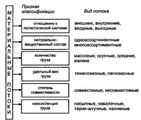 Материальные потоки подразделяют по следующим основным признакам: отношению к логистической системе, натурально-вещественному составу потока, количеству образующих поток грузов, удельному весу образующего поток груза, степени совместимости грузов, консистенции грузов.