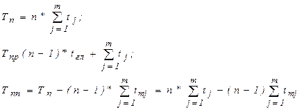 где Тп - длительность цикла обработки партии деталей при последовательном способе календарной организации процесса; Тпр - длительность цикла обработки партии деталей при параллельном способе календарной организации процесса; Тпп - длительность цикла обработки партии деталей при параллельно-последовательном способе календарной организации процесса; n - размер партии одинаковых деталей, шт.; m - число технологических операций, необходимых для изготовления данной детали; tj - длительность j-й технологической операции детали; tгл = max tj - наибольшая длительность технологической операции детали; tmj - длительность меньшей из каждой пары смежных технологических операции детали.