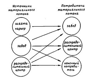 Материальный поток исходит либо из источника сырья, либо из производства, либо из распределительного центра. Поступает либо на производство, либо в распределительный центр, либо конечному потребителю (рис.).
