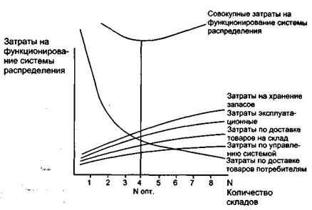 При увеличении количества складов в системе распределения затраты, связанные с эксплуатацией одного склада, снижаются. Однако совокупные затраты распределительной системы на содержание всего складского хозяйства возрастают. Происходит это в связи с так называемым эффектом масштаба: при уменьшении площади склада эксплуатационные затраты, приходящиеся на один квадратный метр, увеличиваются. Например, в торговле при уменьшении площади склада с 10,5 тыс. кв. м до 1,5 тыс. кв. м, то есть в 7 раз, эксплуатационные затраты уменьшаются всего лишь в 5,25 раза. Замена одного склада семью (общая площадь остается той же — 10,5 тыс. кв. м), повлечет за собой увеличение эксплуатационных расходов в 1,4 раза. Здесь также действует эффект масштаба, в связи с чем при увеличении количества складов кривая расходов на системы управления делается более пологой.