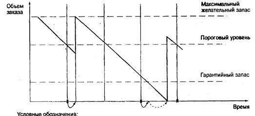 Пороговый уровень запаса в системе "Минимум-максимум" играет роль минимального уровня. Если в установленный момент времени этот уровень пройден, т. е. наличный запас равен пороговому уровню, или не достигает его, то заказ оформляется. В противном случае заказ не выдается, и отслеживание порогового уровня, а также выдача заказа будут произведены только через заданный интервал времени.